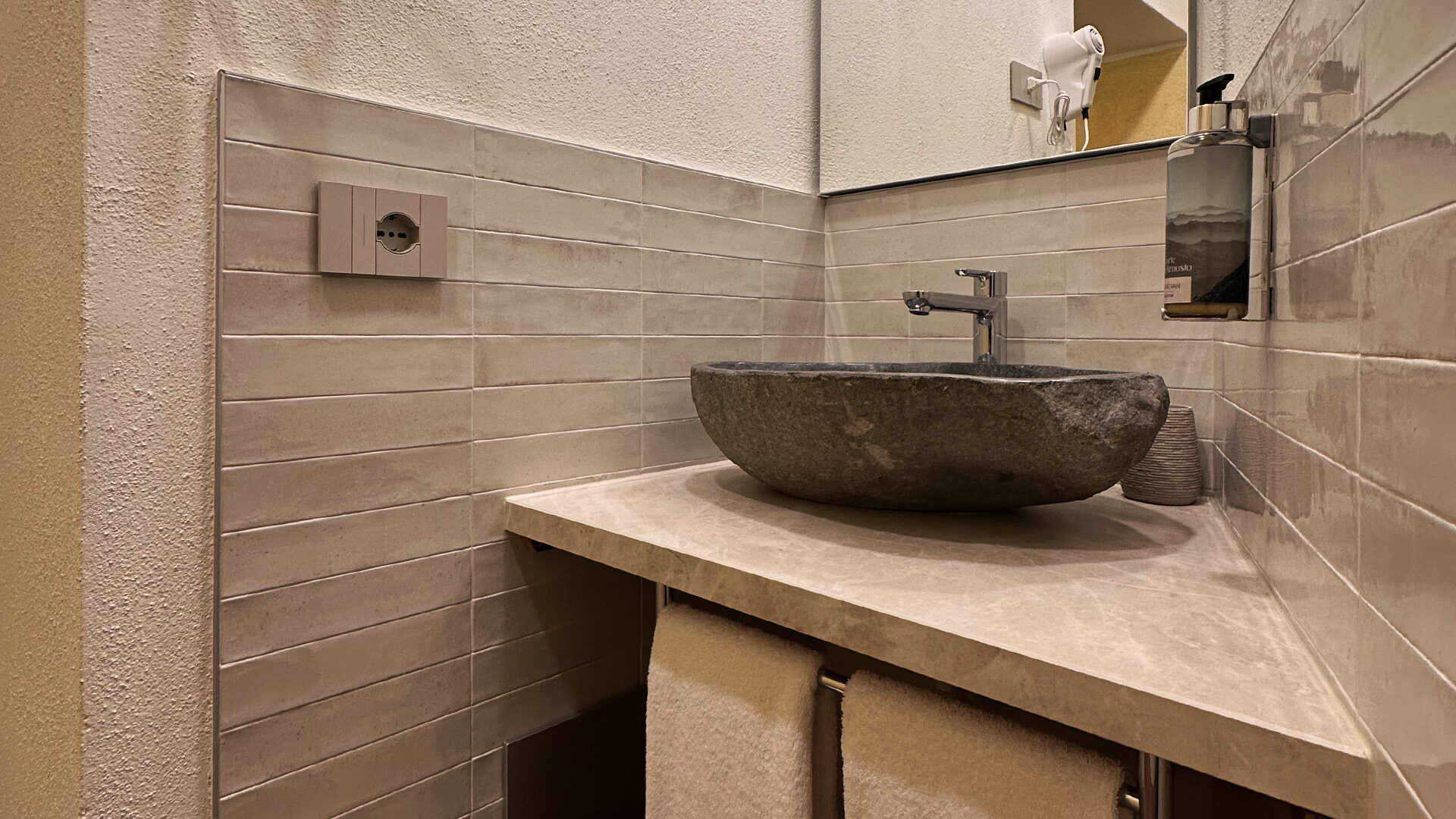 I materiali tipici della Valle Imagna definiscono l’identità dell’ambiente: la pietra locale a vista richiama le antiche dimore di montagna, il legno di castagno arricchisce arredi e finiture con calore naturale, e piccoli dettagli artigianali realizzati dai maestri del luogo aggiungono carattere e unicità. Ne nasce un appartamento moderno e stimolante, dove energia, storia e design si fondono armoniosamente, creando uno spazio accogliente e ricco di personalità.